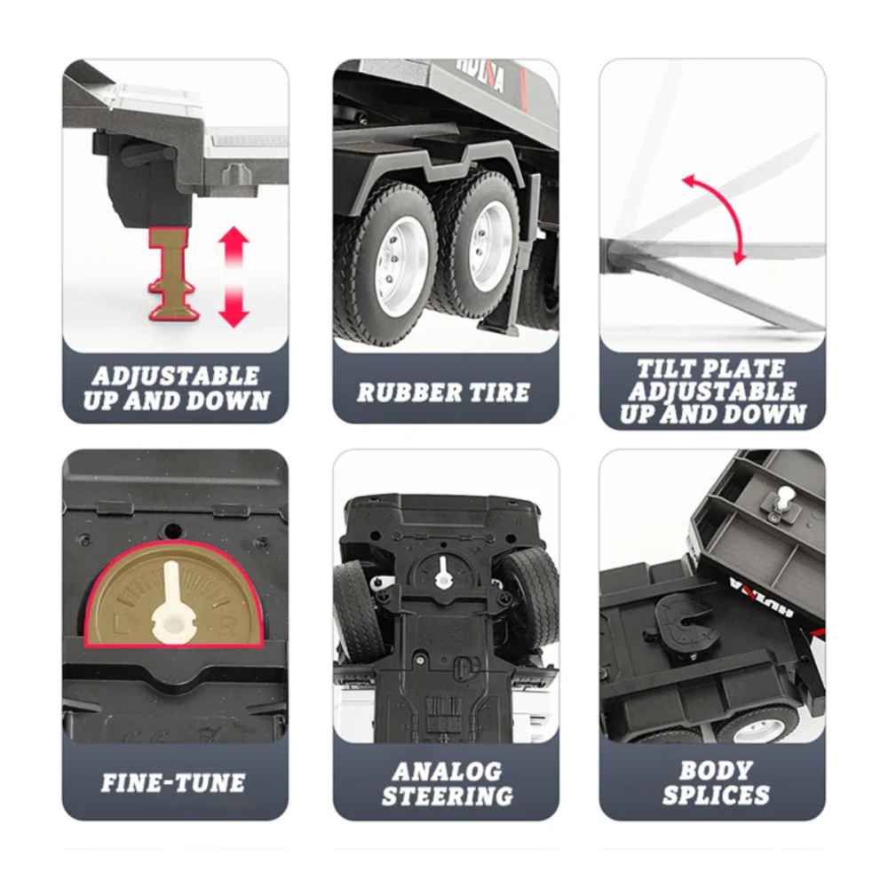 If you want to enhance the play you could add a Huina 1516 RC Excavator which is the perfect size for the rear part of the flatbed and more RC fun! (both the static excavator and Huina 1516 excavator can fit on the flat bed at the same time).